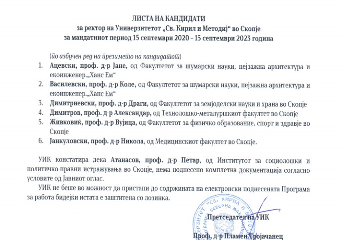 Шестмина професори се кандидати за следен ректор на Универзитетот „Св. Кирил и Методиј“ во Скопје. Универзитетската изборна комисија денеска ги објави нивните имиња. Во наредните три дена незадоволните кандидати можат да достават приговор. Комисијата констатирала дека проф. д-р Петар Атанасов од Институтот за социолошки и политичко-правни истражувања немал поднесено комплетна документација согласно условите од јавниот оглас.