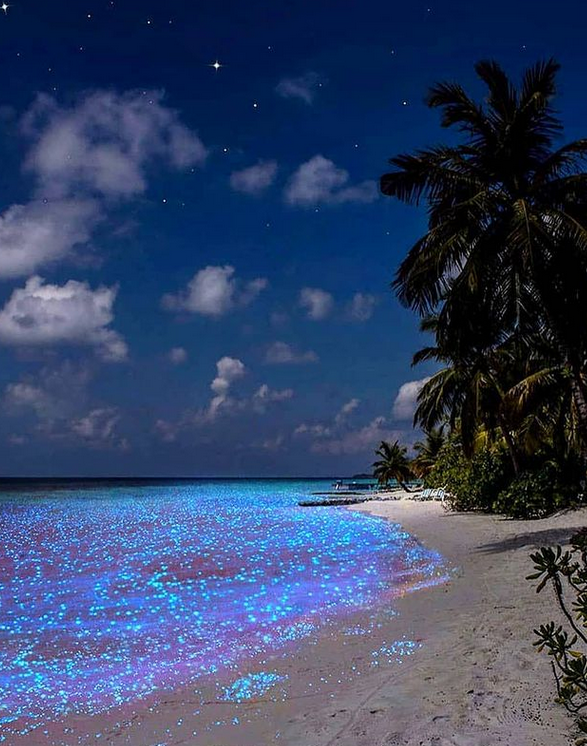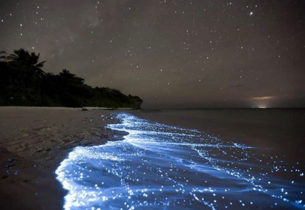 Плажата на островот Ваду на Малдивите е полна со микроорганизми и микроби кои емитуваат светлина и имаат природен капацитет да произведат живописна сина светлина. Овој процес како целина ја персонифицира убавината на плажата и создава неверојатна глетка за посетителите. Многу патници од целиот свет го посетуваат ова место за да го доживеат импресивниот феномен.