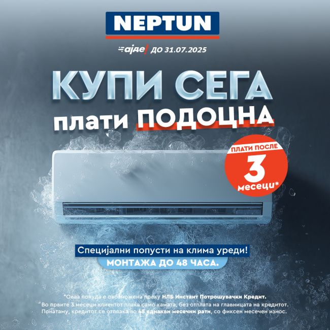 Малопродажниот лидер Нептун лансира нова атрактивна можност за сите купувачи: „Купи сега, плати подоцна“ – кампања која овозможува набавка на клима-уред