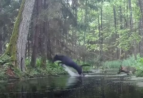 Во една шума камера на полската невладина организација „Сејв вајлдлајф конзервејшн фанд“ забележа нешто необично. Снимено е како волци го преминуваат потокот и потоа скокаат на брегот од спротивната страна.