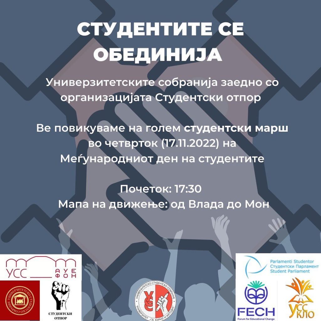 - Ве очекуваме в четврток, по повод Меѓународниот ден на студентите, со почеток во 17:30 часот, да излеземе сите заедно, сплотени на голем студентски марш, каде што тргнувајќи од Влада, па до МОН ќе го завршиме нашиот марш и јасно и гласно ќе ги искажеме нашите барања. Ги повикуваме сите што се вклучени активно во образованието, меѓу кои средношколци, професори, декани и ректори, да ни дадат поддршка и да се приклучат на маршот. Ајде сите заедно да се избориме за нашите студентски права и подобар студентски стандард - се наведува во објавата на УСС на УКИМ.