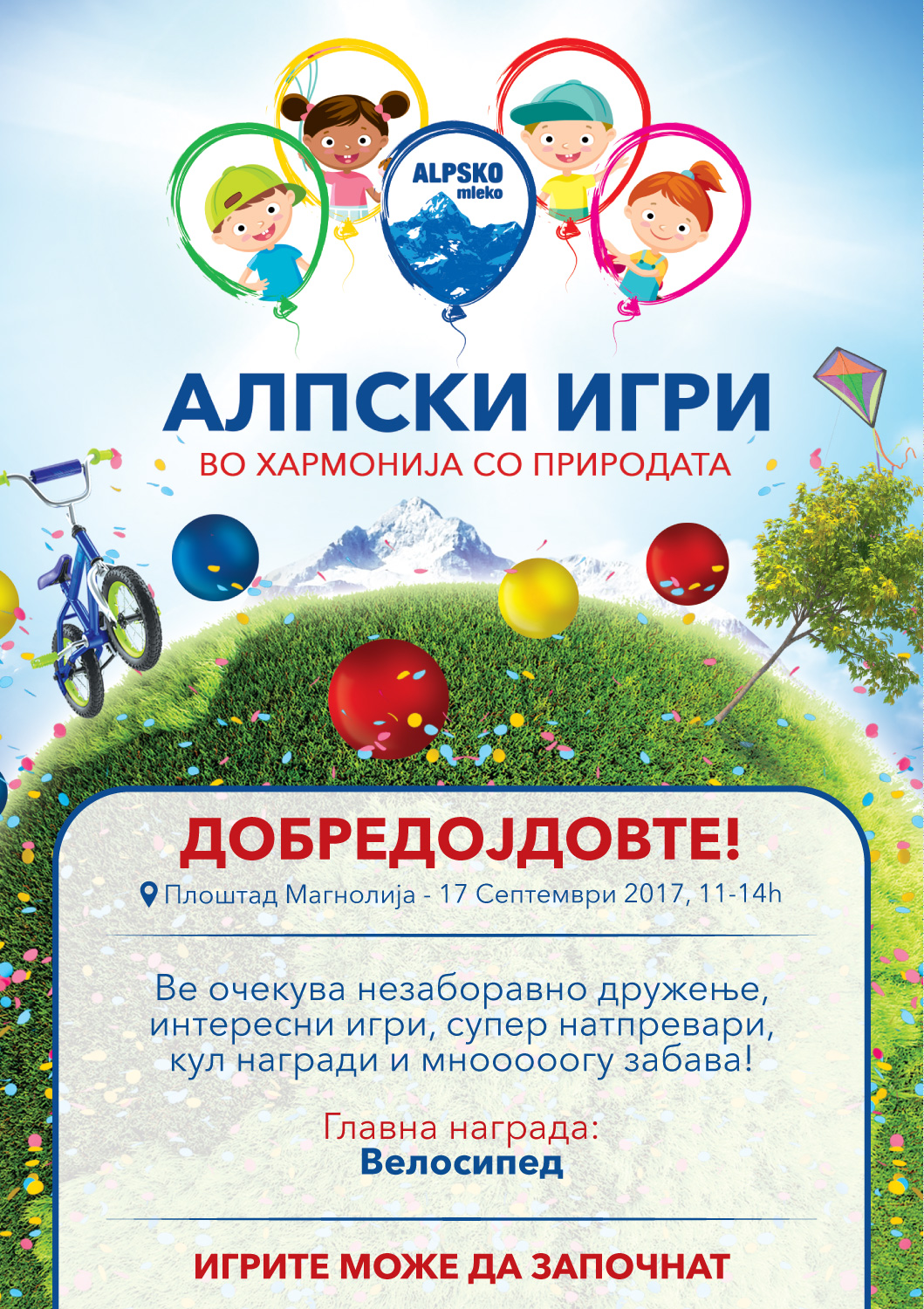 По огромниот успех и супер атмосфера на Алпските игри во Скопје, што и покрај дождот и неповолните временски прилики им донесе многу радост, насмевки и награди на децата, тимот на Алпско млеко одлучи ова позитивно искуство да го сподели со дечињата од другите градови и населени места низ Македонија.