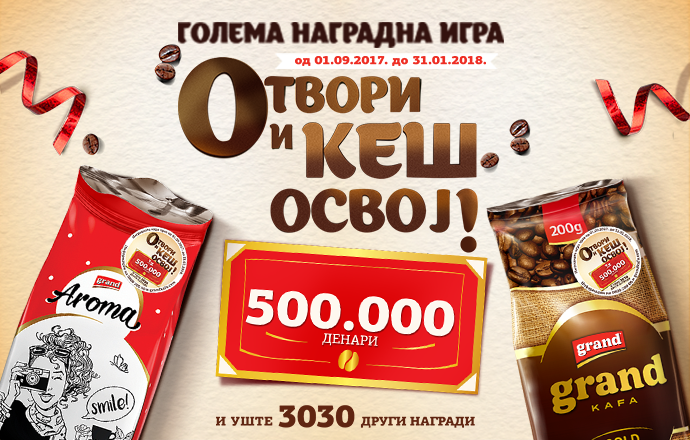 Од почеток на септември сите љубители на Гранд Голд и Гранд Арома кафе имаат можност во рамките на наградната игра „Отвори и кеш освој!“ да добијат некоја од 3033 вредните парични или трговски награди.