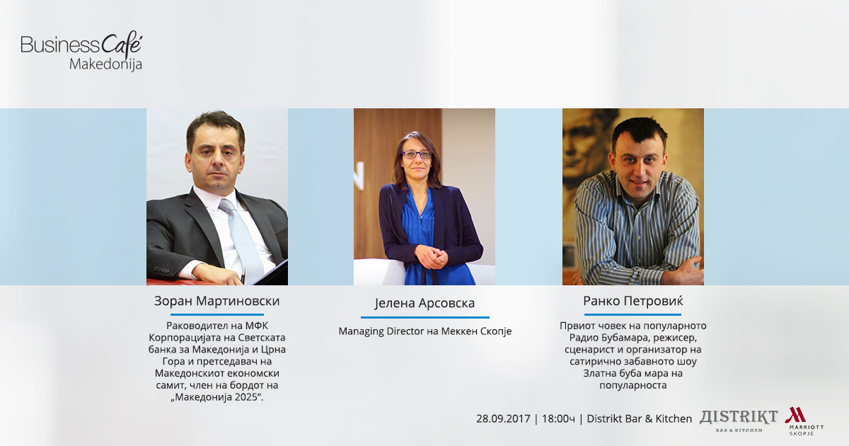 На 28.09.2017 година (четврток) од 18:00 чaсот во Дистрикт барот во хотел Мериот ќе се одржи 25. Бизнис Кафе Македонија. Гостите ќе слушнат уаште неколку успешни професионални и животни приказни.