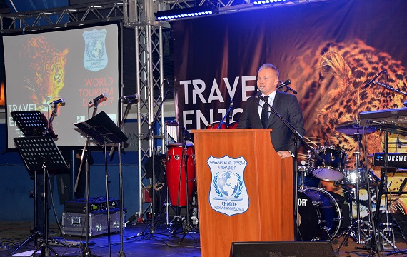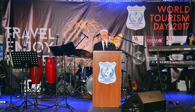 Одбележувањето на овој значаен глобален настан, продолжи и во вечерните часови на платото пред УТМС со организирање на прием на видни претставници од релевантните институции од Р. Македонија, претставници од дипломатскиот кор како и претставници од бизнис секторот. Со пригодно обраќање настанот го отвори ректорот на Универзитетот за туризам и менаџмент – Скопје, проф. д-р Аце Миленковски, кој во својот говор го потенцираше глобалното значење на туристичката индустрија укажувајќи на значењето на човечкиот фактор во генерирањето на промените за подобра иднина. Во таа насока ректорот истакна дека туризмот е значаен за глобалниот економки развој, социјално зајакнување на заедниците со отварање на нови работни места, зачувување на животната средина и справување со климатските промени, почитување на различноста, идентитетот, култура и мирот како основен предуслов за развој и напредок на глобално ниво.