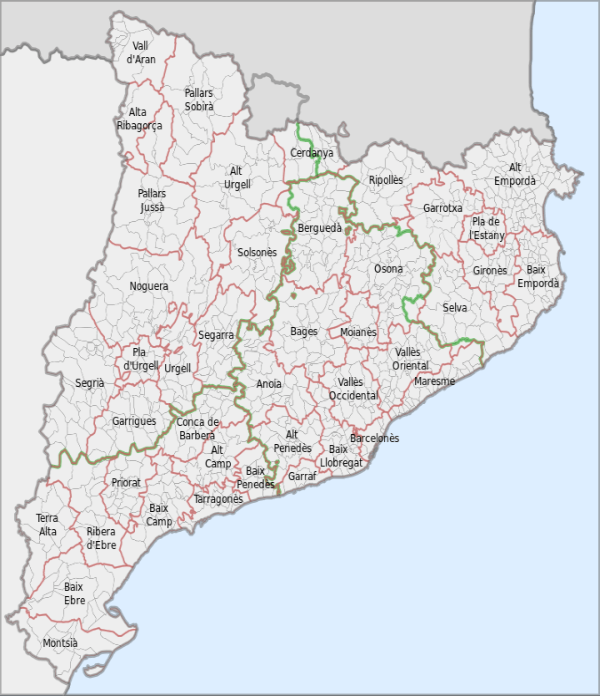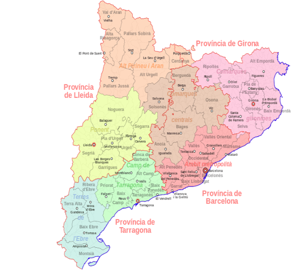 Најмалата област е Барселонес, со 145 квадратни километри, но тука е лоцирана Барселона и е најнаселена, со 2,2 милиона луѓе. Најмалку населена е Алта Рибагорка - само 3.873 луѓе.