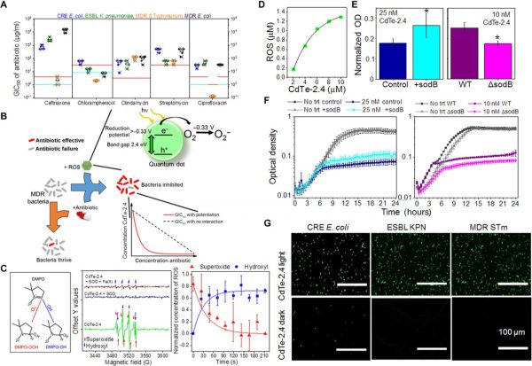 Во истражувањето спроведено неодамна, антибиотиците потпомогнати од експерименталните квантни точки биле 1.000 пати поефикасни во борбата против бактериите од самите антибиотици. Квантните точки што се користеле биле со дијаметар од 3 нанометри. Точките биле направени од кадмиум телурид, стабилно кристално соединение што често се користи во фотоволтаиците. Електроните на квантните точки реагираат на зеленото светло на одредена фреквенција, предизвикувајќи тие да се поврзат со молекули на кислород во телото и да се форира супероксид. Бактериите што ја апсорбираат супстанцијата не се во можност да ги заштитат антибиотиците бидејќи нивната внатрешна хемија не одржува рамнотежа.