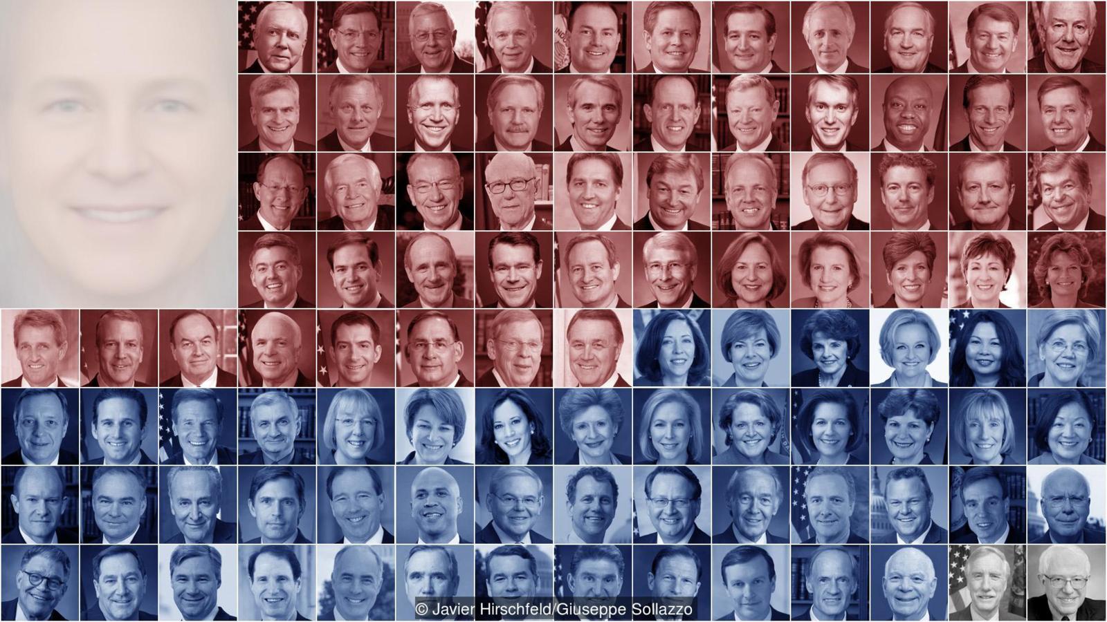 Всушност, гледате во лице на американската политика во 2017 година. Ова е слика на американскиот Конгрес – сите 100 сенатори и 435 члена на Претставничкиот дом, сплотени во еден. Сликата е креирана од „Би-би-си фјучр“ за да покаже како изгледа лицето на политиката.