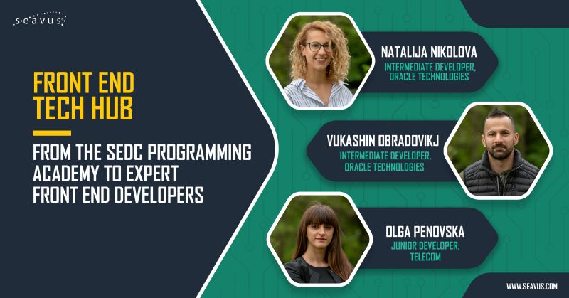 Разговаравме со тројца членови на тимот на Сеавус, кои се вработиле токму преку Академијата: Вукашин Обрадовиќ - Intermediate Front-end девелопер, Олга Пеновска – Junior Front-end девелопер (Angular + Node) и Наталија Николова – Junior Front-end девелопер (React + Java).