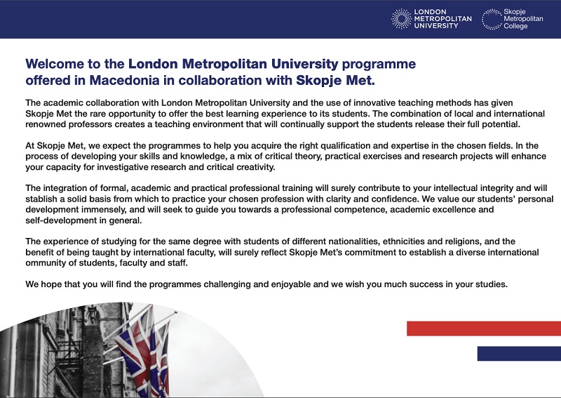 London Metropolitan University (MET) е реномирана образовна институција со седиште во Лондон. Традицијата, квалитетот на студиите, како и извонредноста на наставата го прават светски реномиран универзитет и избор на секој иден студент во светот.