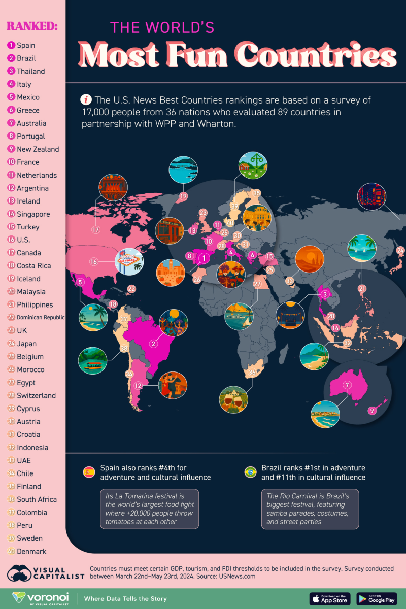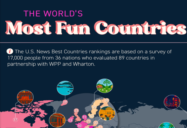 Анкетата, спроведена од „Ју-ес Њуз & ворлд рипорт“ меѓу 22 март и 23 мај 2024 година, се базира на глобални перцепции и ги прикажува 40. најзабавни земји во светот.