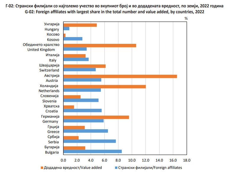 Во 2022 година 1.727, или 2,6% од вкупниот број активни пазарноориентирани претпријатија (67.296) во рамките на набљудуваните сектори биле странски филијали – домашни претпријатија контролирани од странство. Тие ангажирале 20,9% од вкупно вработените, реализирале 40,4% од вкупниот промет, односно 32,9% од вкупната бруто-додадена вредност во набљудуваниот опфат, што укажува на нивното значително влијание врз домашната економија, соопшти Државниот завод за статистика.