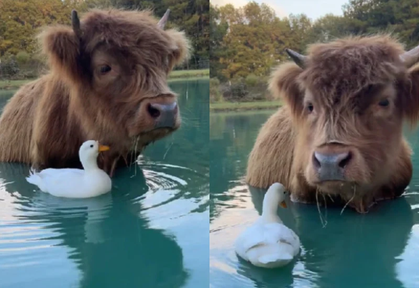 Сопственичката на бикот и патката, Бре Бојет, објави видео на кое се гледа како нејзиниот бик Дампи и патката Маршмелоу се капат заедно во езерце на нејзиниот имот.