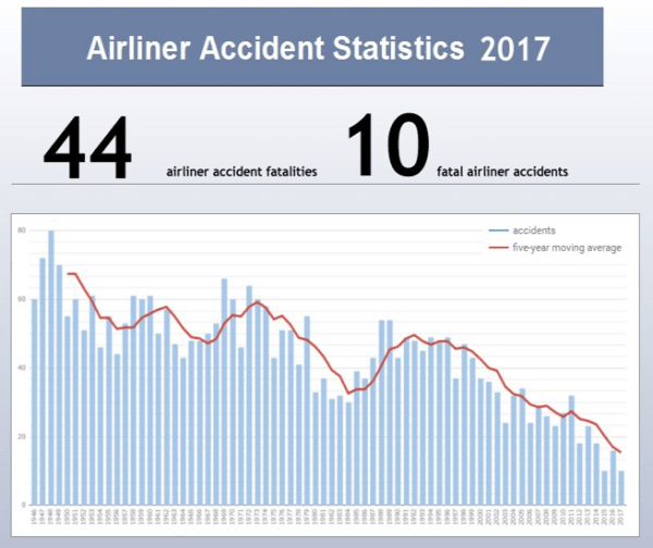 Иако летањето со комерцијален патнички авион на глобално ниво беше безбедно, индустријата сепак имаше минимални загуби, односно имало десет несреќи во кои биле вклучени комерцијални патнички или товарни авиони, при што загинале 44 лица, во 2017 година. Компанијата се фокусира на несреќи во кои биле вклучени комерцијални авиони, карго или патници што превезуваат повеќе од 14 лица, и не ги вклучи 35. загубени животи при несреќата на товарен авион во Киргистан.