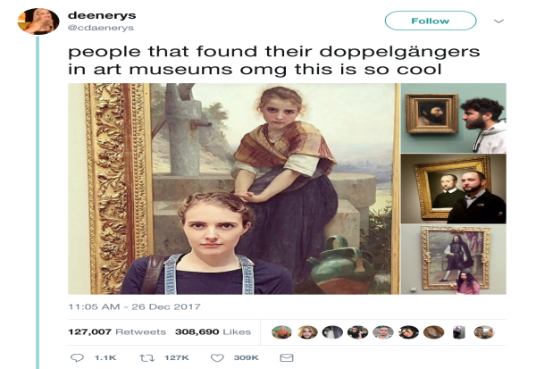 Девелоперите од бесплатната апликација „Google Arts & Culture App“ на интернет-корисниците им овозможија да прикачуваат сопствено селфи со надеж дека ќе го пронајдат нивниот двојник во огромната дигитална колекција.