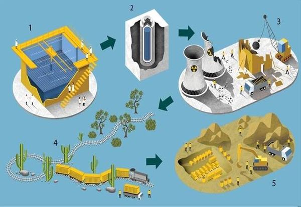 Во нуклеарната централа „Сан Онофре“ работниците префрлаат 2.668 горивни склопови во кои се содржат 1.109 метрички тони радиоактивен ураниум во огромни контејнери од не’рѓосувачки челик. Тие се наоѓаат во длабок базен за ладење направен од челик, на температура од 20 Целзиусови степени, додека работниците да ги пренесат во складиште.