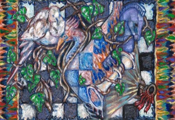 Загатката вредна 50.000 долари кодирала серии на нули и единици во редови пламени насликани околу работ на платното.