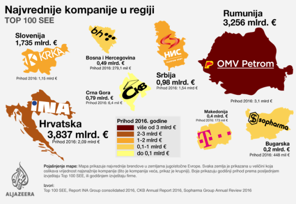 Хрватската компанија „Ина“ е највредната компанија во регионот веќе втора година по ред. Според извештајот на „Сињуз топ-100 2017“, „Ина“ е вредна 3,837 милијарди евра.