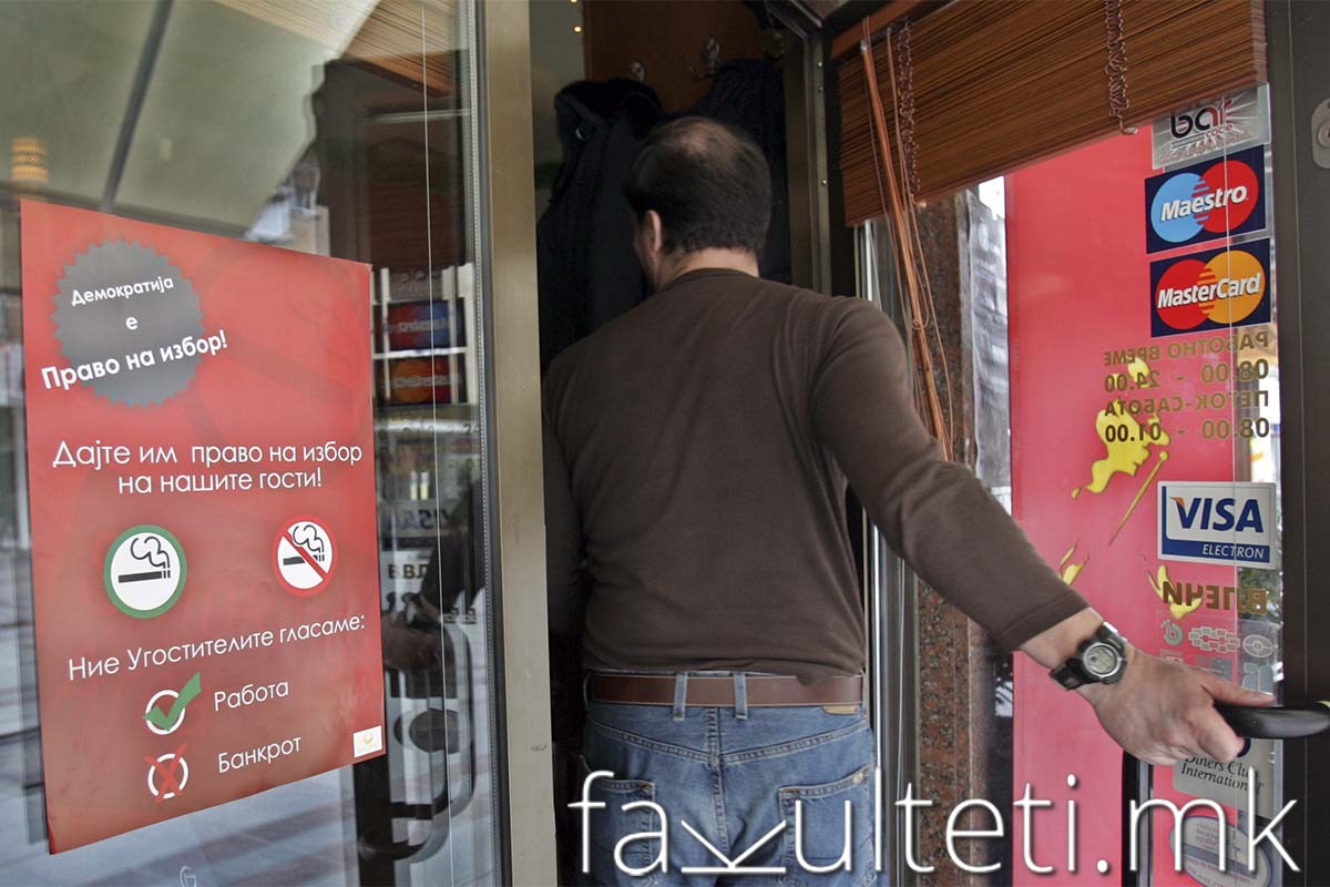 - Пред измената во Законот да стане актуелна многу ретко се случуваше некој гостин да запали цигара во локалот. Ние ќе го опоменевме дека не смее и ќе ја изгаснеше. Но сега, речиси сите што седнуваат на терасата палат цигара, а ние сме немоќни да го спречиме тоа. Да бидам искрен, јас ако им забранам, ќе одат во соседниот локал каде што тоа ќе им го дозволат. Последниве месеци немало инспекциски контроли за пушењето, па можеби тоа е една од причините што гостите, а и ние, опуштија повеќе - вели сопственик на кафуле во центарот на Скопје, кој инсистираше на анонимност.
