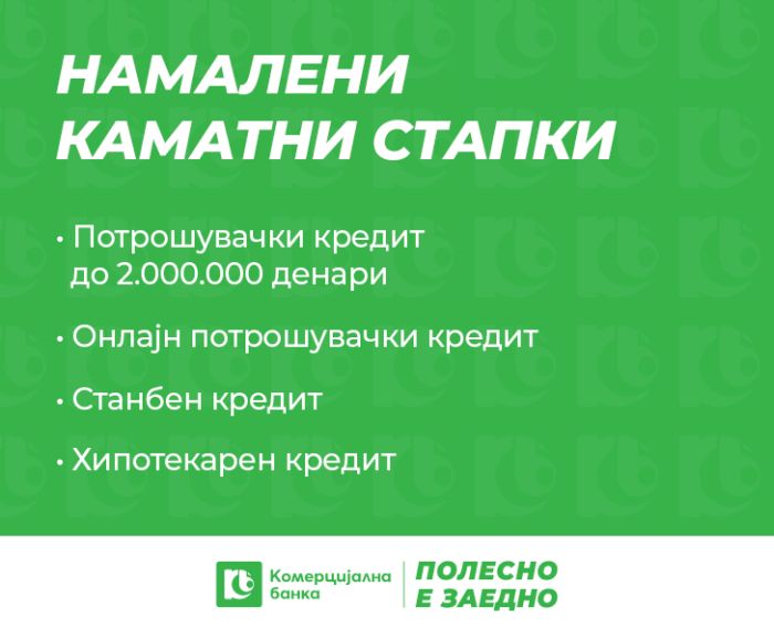 Комерцијална банка ги намали каматните стапки на новоодобрени потрошувачки, станбени и хипотекарни кредити, со што им овозможи на клиентите атрактивни услови за реализација на нивните планови.