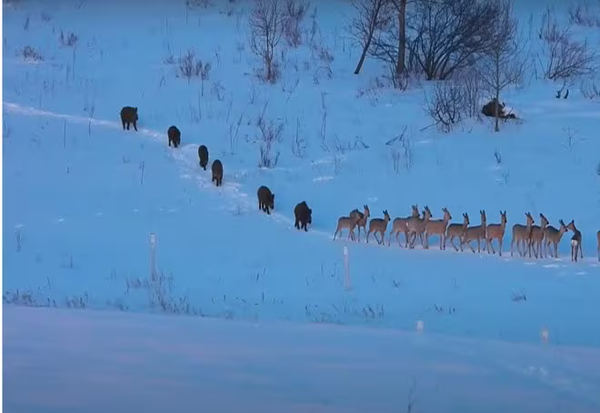 Видео што неодамна се појави на „Јутјуб“, а е снимено во Русија, открива необична сцена: по зимска патека одат срни, а по нив одат диви свињи.