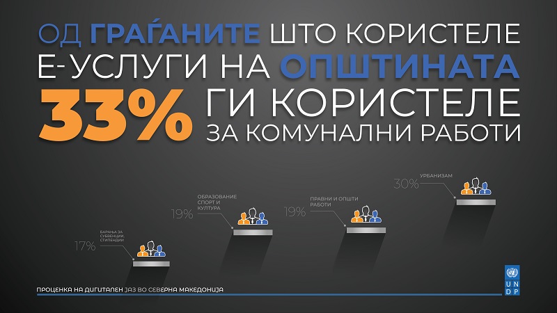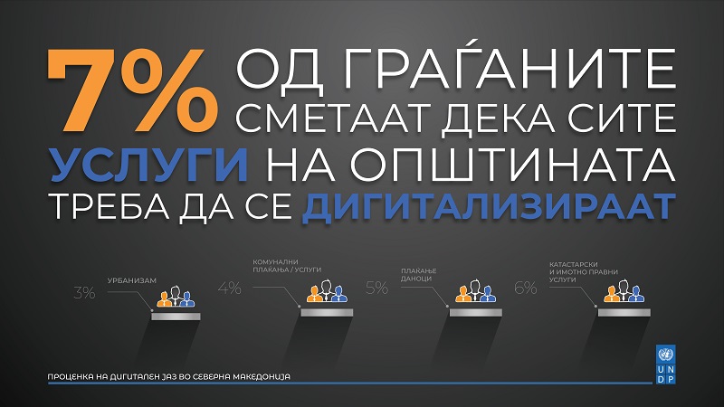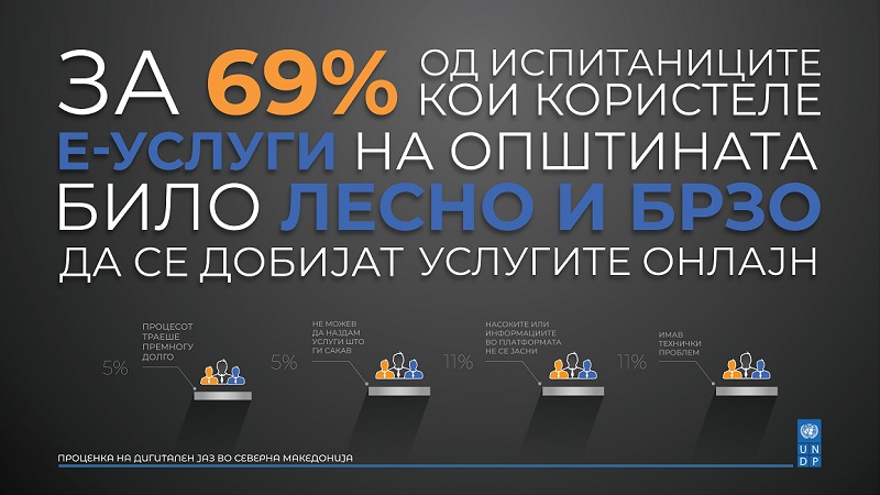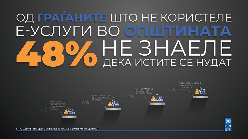 Истражување на УНДП покажа дека граѓаните во земјава не користат е-услуги во своите општини. Според истражувањето, цели 86% од граѓаните никогаш не користеле е-услуга на општината, наведувајќи различни причини. Притоа, најголем дел (48%) не знаеле дека услуги што се добиваат на шалтер можат да се добијат и онлајн.