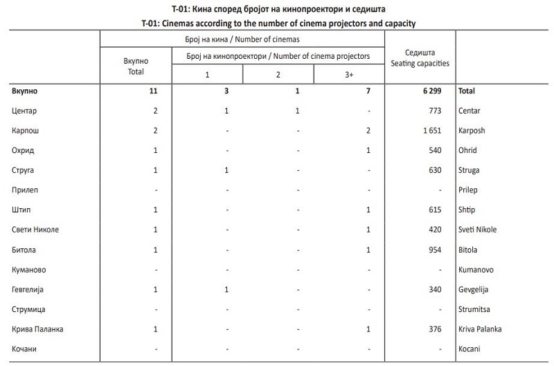 Статистиките покажуваат дека во Скопје има 4 кина, по две во Центар и во Карпош, кои заедно имаат 2.424 седишта. Според статистиките, најголем капацитет во земјава има битолското кино, кое има 954 седишта, а не се мали ниту киното во Струга, кое може да собере 630 гледачи, киното во Штип, кое има 615 седишта или она во Охрид каде што во филмската магија може да уживаат 540 лица. Светиниколското, пак, има 420 седишта, додека киното во Крива Паланка има 376, а она во Гевгелија 340 седишта.