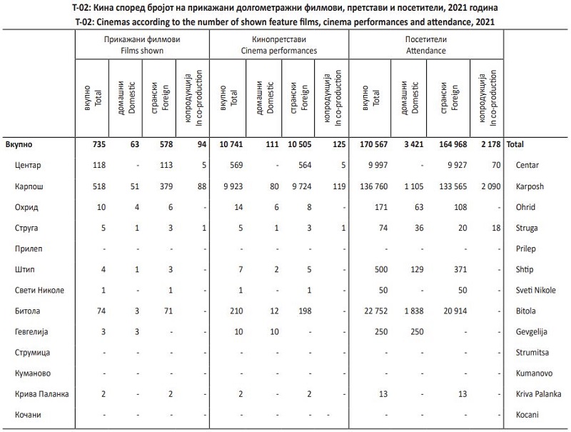 Податоците за кинопретставите ја нагласуваат разликата во животот на жителите во престолнината и оние во внатрешноста. Имено, од 10.741 кинопретстава во 2021 година, 10.492 биле во скопските кина. Потоа следува битолското кино со 210 кинопретстави, што изгледа и како голем број во споредба со кинопретставите во охридското (14), гевгелиското (10), штипското (7), струшкото (5), кривопаланечкото (2) и светиниколското кино каде што во цела 2021 година имало само една кинопретстава.
