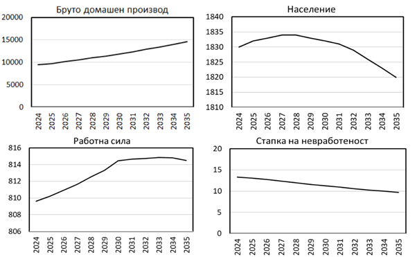 На ова место се поставува прашањето: Какви трендови може да се очекуваат кај македонскиот пазар на труд до 2035 година? Секако дека македонската економија во наредниот период нема да остане надвор од глобалните тенденции кои се очекува, во помала или поголема мера, да се одразат и кај нас. Според проекциите на CEDEFOP прикажани на графиконите подолу, се предвидува умерен, но постојан раст на бруто-домашниот производ проследен со постепено намалување на стапката на невработеност. Вкупното население умерено би пораснало до 2028 година, но потоа се очекува извесно намалување. Слично, работната сила постепено би се зголемувала до 2030 година, но потоа се предвидува нејзина натамошна стагнација до 2035 година.