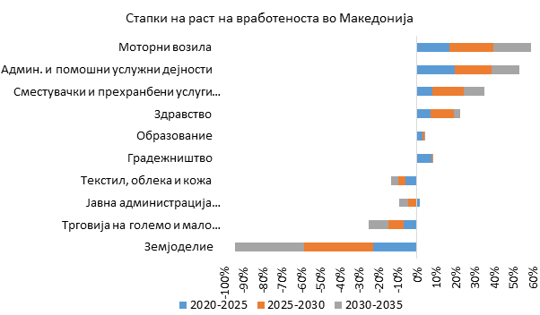 Во однос на структурата на работните места според економски дејности кои се предвидуваат за наредниот период, исто така, видлива е сличност со движењата во останатите делови од Европа. Имено, според графиконот подолу може да се забележи дека пораст на вработеноста ќе има во производството на делови за моторни возила, административни и помошни услужни дејности, сместувачки и прехранбени услуги, и здравство. Порастот кај здравството и помошните услужни дејности е директно поврзана со стареењето на населението и намалувањето на работната сила. Скоро незначителни позитивни промени во вработеноста до 2035 година се очекуваат во градежништвото и образованието. Од друга страна, пад на вработеноста би имало во земјоделието, а потоа кај трговија на големо и мало, јавна администрација и производство на текстил, облека и кожа. Тоа се дејностите каде што, под влијание на новите технологии, во најголема мера би се заменил човековиот труд.