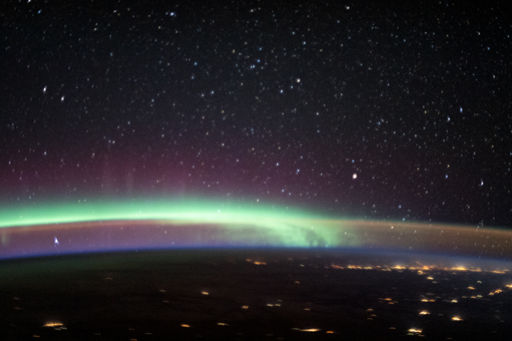 Но, аурората е само еден дел од оваа феноменална фотографија. Десно на сликата може да се види жолто-црвена лента светлина веднаш над нашата планета. Тоа се нарекува воздушен сјај и е посуптилна светлина од аурората, но е еднакво интересна.