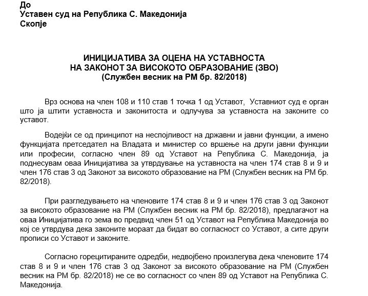 Тој од Уставниот суд бара да процени дали новата одредба која на државните функционери им остава простор да може да бидат унапредени во наставно-научни звања и покрај мирувањето на работното место на факултетите е противуставна.