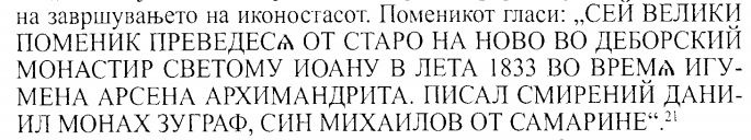 - Забележливо е дека во „Великиот поменик“ ништо не се споменува за најважните работи по изградбата на црквата, а во прв ред изработката на иконостасот, владичкиот трон, игуменскиот стол и другите резбарски дела. Веројатно имало посериозни причини за таквата празнина во поимникот. Пишува само: „..грамадниот иконостас е уметничка резба во растителен и животински свет, каде што мајсторите се претставиле и себеси. Тие се истите оние деберчани што работеле во 1824 година на иконостасот на црквата ,Св. Спас’ во Скопје“ - вели Ќорнаков.
