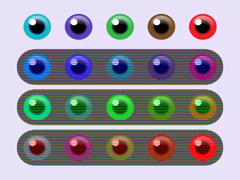 На сликата подолу можеме да го видиме оригиналното око што се користи во секоја колона без интервенцијата на линиите и јасно е дека има пет различни бои.