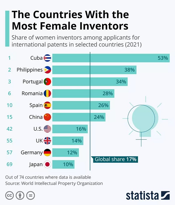 На глобално ниво, само 17 отсто од сите истражувачи што аплицирале за патент минатата година биле жени. Куба убедливо води со учество на жените од 53 отсто.