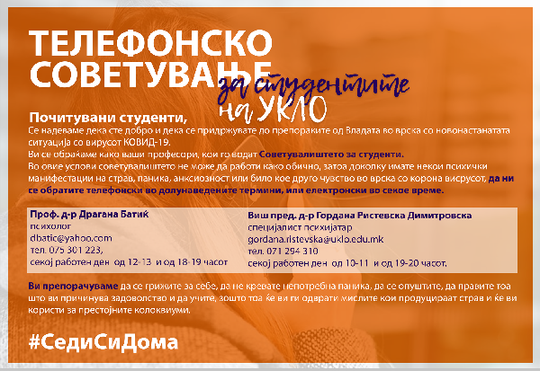 Психолошкото советувалиште на УКЛО почна со телефонски советувања за студентите и вработените. Во рамките на мерките на Универзитетот за справување со коронавирусот овозможена е секојдневна телефонска психолошка поддршка.