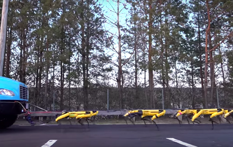На снимката може да се видат десет роботи како синхронизирано маршираат и влечат камион. Роботите се поврзани како да се кучиња што влечат санка, но овие без тешкотии влечат камион.