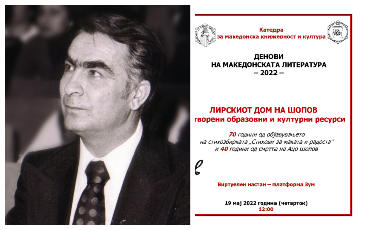 По повод 70 години од објавувањето на стихозбирката „Стихови за маката и радоста“ и 40 години од смртта на познатиот македонски писател Ацо Шопов, денеска ќе почне манифестацијата Денови на македонската литература, во организација на Катедрата за македонска книжевност и култура при Филолошкиот факултет „Блаже Конески“ - Скопје. Почетниот настан е насловен „Лирскиот дом на Шопов – отворени образовни и културни ресурси“, а преку повеќејазичната веб-платформа која ќе биде достапна, ќе може да се проследи голем дел од творештвото на овој реномиран македонски поет, голем фонд на документи и податоци, како и критички одгласи за неговата поезија и голем обем на видеоматеријали и фотодокументација.