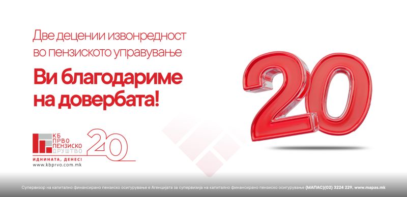 Денес, кога ќе погледнеме назад, зад нас стојат 20 години исполнети со предизвици, посветеност, но и голем успех. Со портфолио од над 1,2 милијарди евра (извор: КБ Прво пензиско друштво АД Скопје) и над 300 000 членови (извор: mapas.mk 30.04.2025), кои за нас се многу повеќе од бројка. Тоа е суштината на нашето постоење, визија и иднина. Зад секој член стои неговата доверба кон нас како друштво, кое има цел да ги заштити неговите интереси, да овозможи сигурност и да создаде вредност на неговите средства.