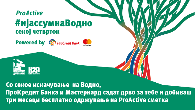 Продолжува акцијата со секое скенирање на QR кодот на врвот на Водно да засадите дрво, но сега со дополнителни нови можности - три месеци бесплатно користење на ProActive сметка на ПроКредит Банка со која станувате дел од одговорната заедница.