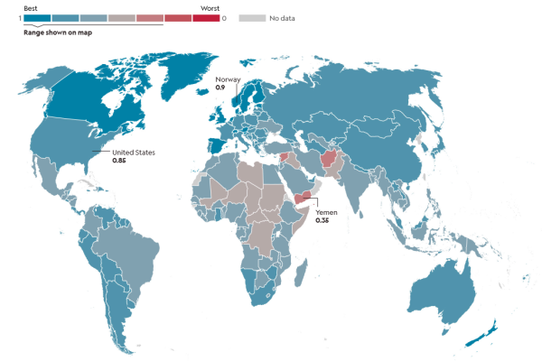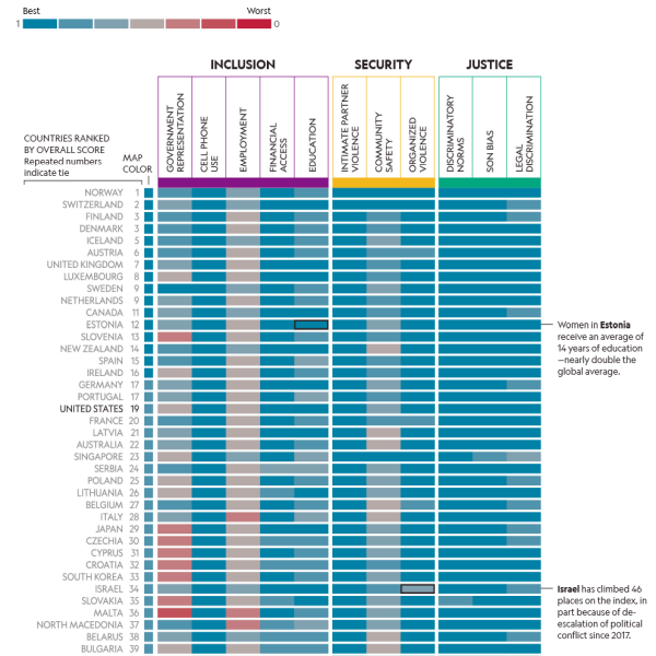 Ниту една земја нема сè остварено кога станува збор за родова еднаквост, но на некои места е подобро да се биде жена. Индексот за жени, мир и безбедност се обидува да ги разбере овие глобални разлики со мерење на вклученоста на жените во општеството, чувството на сигурност и изложеноста на дискриминација - клучни показатели за тоа каде се наоѓаат жените во општествата.