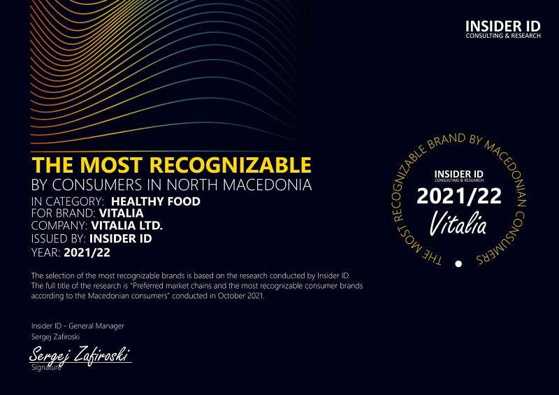 Во истражувањето спроведено од компанијата за истражување, анализи и консалтинг - InsiderID, „Најпознатите брендови според потрошувачите во Македонија“, Виталиа ја задржува позицијата и во 2021 како најпознат бренд во категоријата ЗДРАВА ХРАНА. Анализирани се вкупно 18 категории на производи, а анкетирани се повеќе од 1.250 активни потрошувачи на територијата на целата држава.