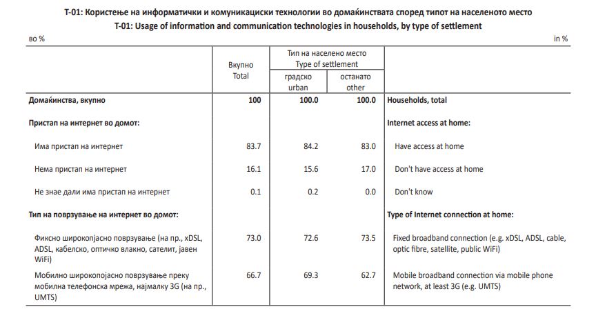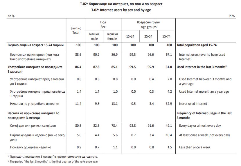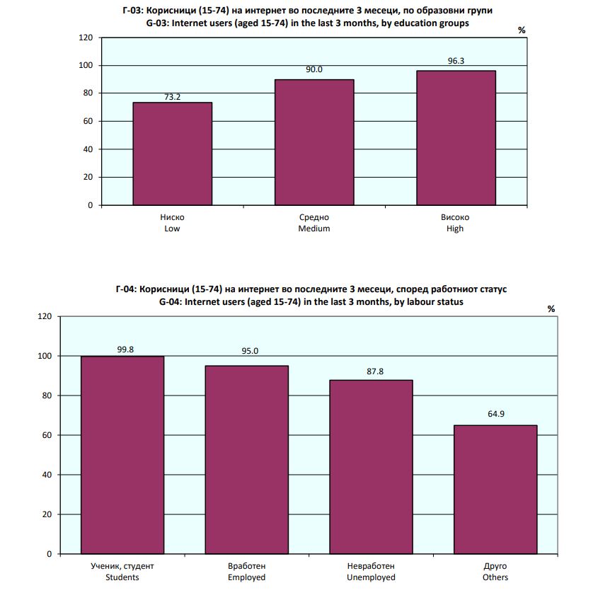 Податоците покажуваат и дека 96,3 отсто од високообразованите лица во земјава се корисници на интернет, а процентот на корисници на интернет кај оние со средно образование е 90%, додека кај оние со ниско е 73,2 отсто.