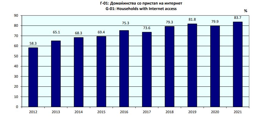 Според податоците на Државниот завод за статистика, во првото тримесечје од 2021 година, 83,7% од домаќинствата имале пристап до интернет од дома, што е најголем процент од 2012 година наваму. Вкупно 16,1 отсто од домаќинствата немаат пристап до интернет, а 0,1 отсто не знаат дали имаат пристап. Учеството на домаќинствата според типот на населеното место со широкопојасен интернет во вкупниот број домаќинства е 87,1% во 2021 година.