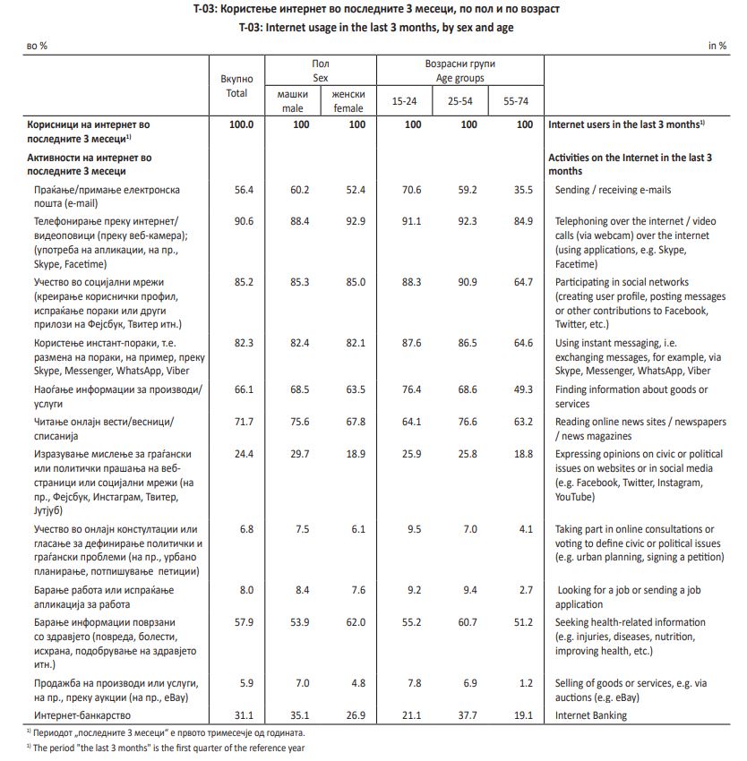Податоците покажуваат дека населението во Македонија најмногу го користи интернетот за телефонирање преку интернет, учество во социјални мрежи, допишување, читање онлајн вести и барање информации за производи, но и за здравјето.