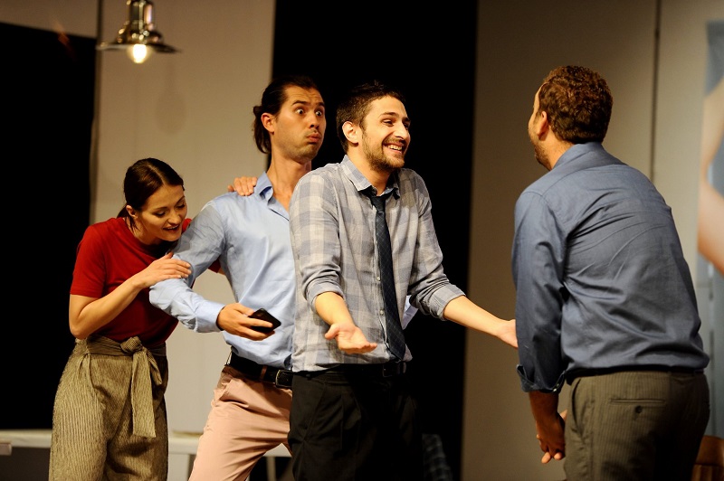 Цветановски (втор од десно) во сцена од претставата „Несоодветно за на работа“, заедно со Сања Арсовска, Стефан Вујовиќ и Зоран Љутков (фото: Никола Јакимов)