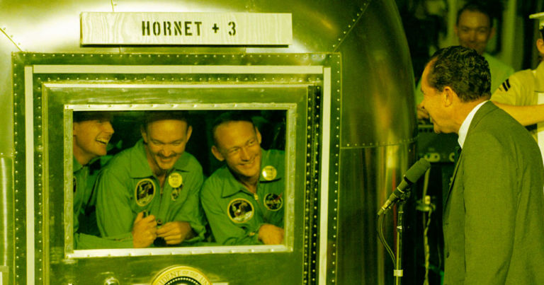 Тие тројцата најпрвин биле сместени во мобилен капацитет за карантин, а потоа биле транспортирани во безбедна зграда наречена лабораторија за лунарен прием, која била направена за карантин на астронаути и материјал донесен од Месечината. Многу години подоцна, откако се покажа дека на Месечината нема живот, НАСА ја прекина оваа практика.
