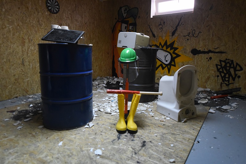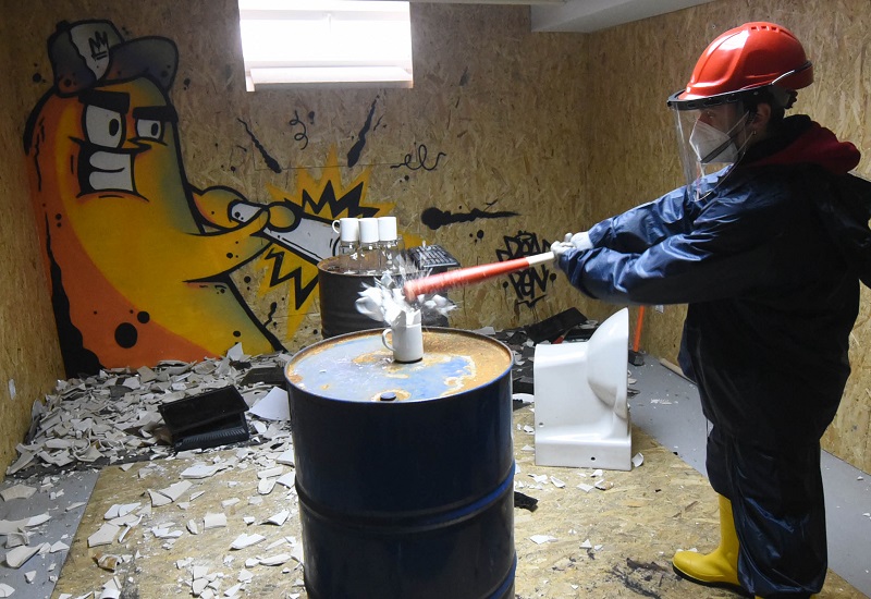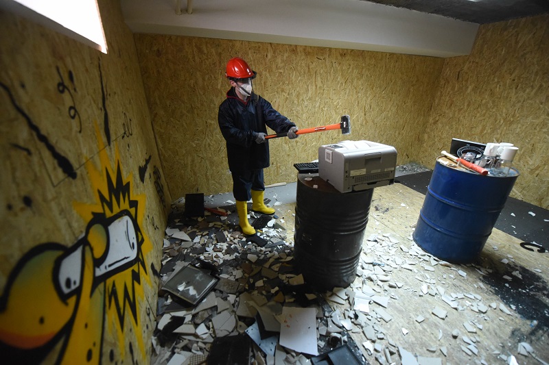 Во антистрес-собата се крши стакло, кујнски прибори, керамички производи, односно плочки и санитарии, како и веќе рециклирана стара и соодветна ИТ и електронска опрема. Горан вели дека стаклото се рециклира, а деновиве истражува дали може керамиката, санитариите и плочките да се мелат и во форма на рециклиран песок да најдат своја примена понатаму.
