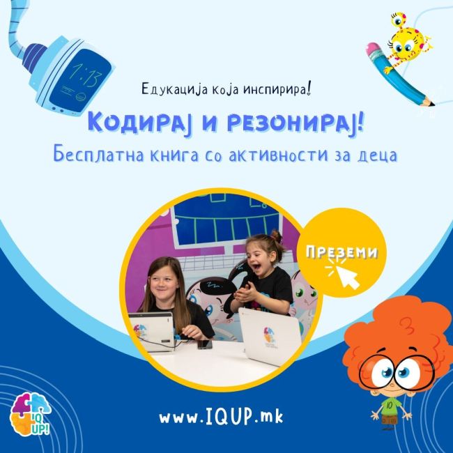 Со цел да ги поттикнеме првите чекори на вашето дете во програмирањето, во IQ UP! ја создадoвме книгата со активности „Кодирај и резонирај“. Оваа книга е дизајнирана да биде и забавна и едукативна, воведувајќи ги основите на програмирањето преку серија интерактивни активности кои го поттикнуваат логичкото размислување и креативноста.