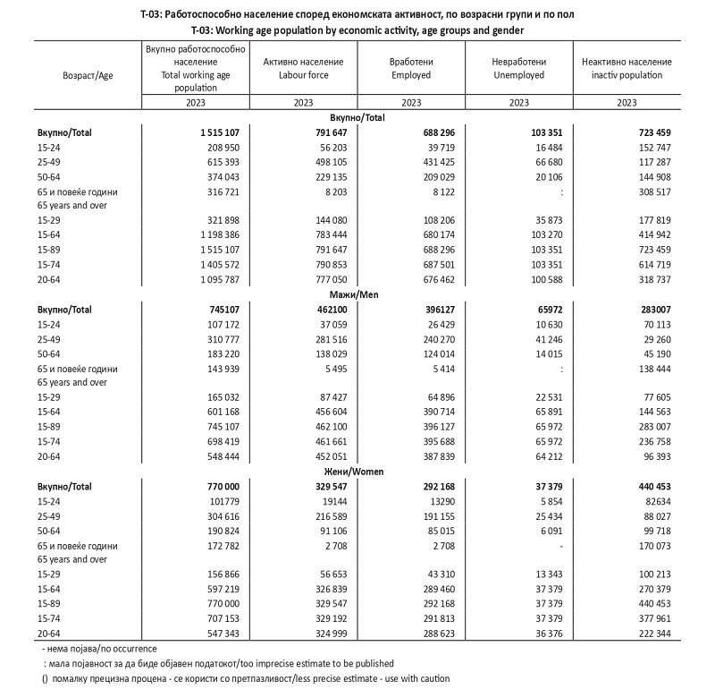 Податоците на ДЗС покажуваат дека најголем број од вработените во земјава се на возраст од 25 до 49 години (431.425 лица), а на таа возраст се и најголем број од невработените (66.680 лица). Кај неактивното население, пак, најбројни се повозрасните, односно оние постари од 65 години, чиј број изнесува 308.517 лица.